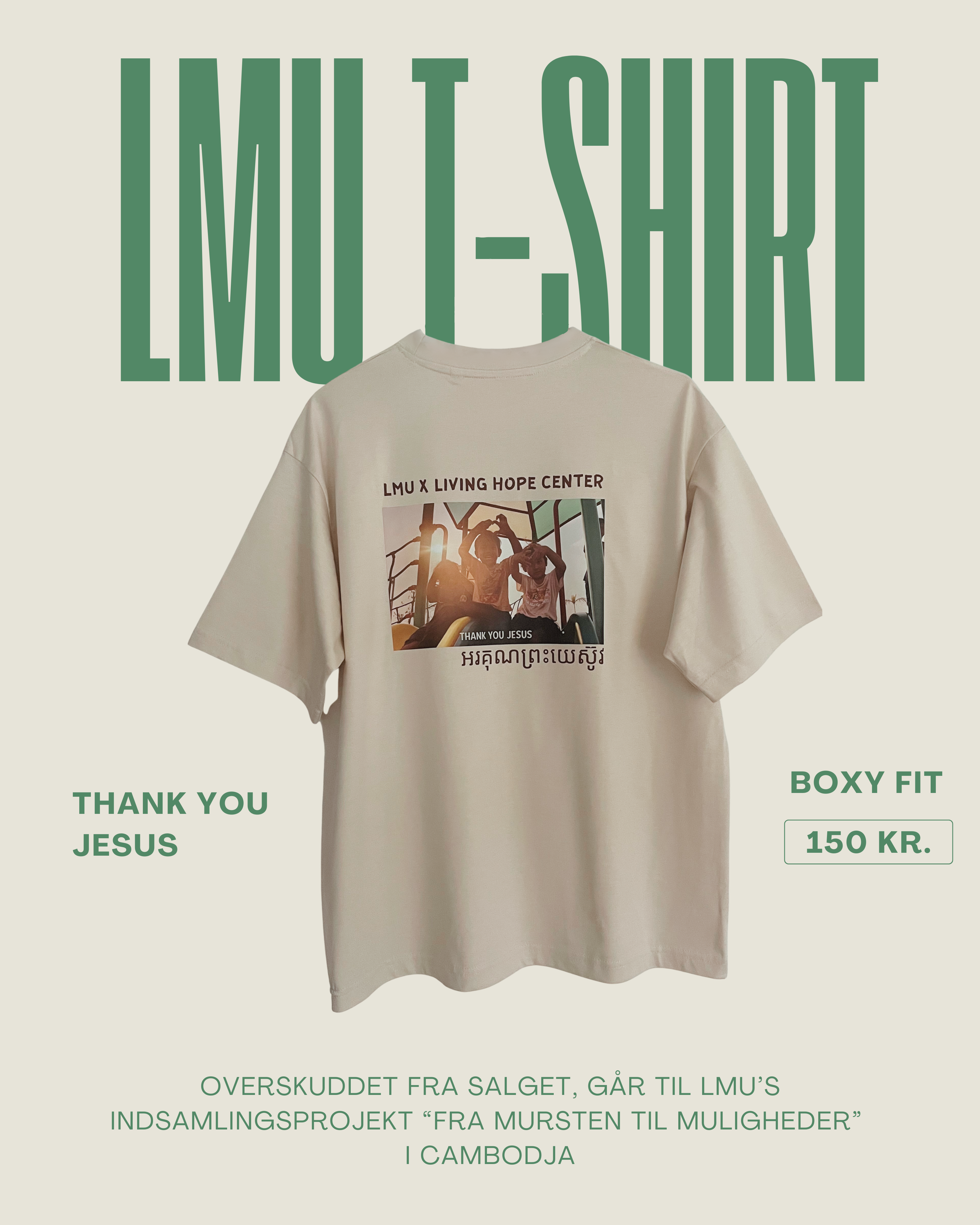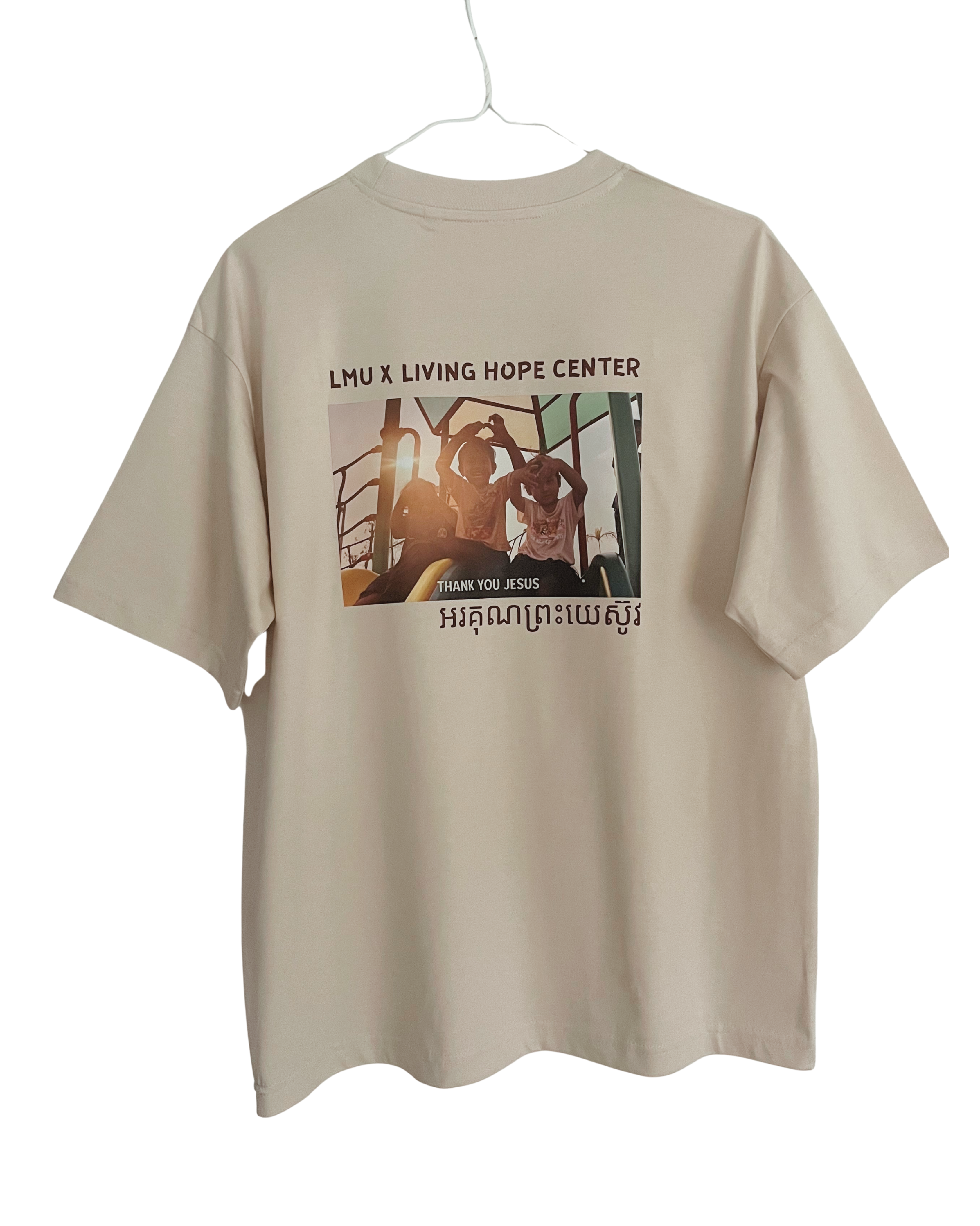 LMU-missionsprojekt t-shirten er en stilfuld og oversized t-shirt, der med sit rygdesign viser børns taknemmelighed til Jesus og missionsprojektet, så børn og unge kan møde Jesus igennem Living Hope Center i Cambodja.