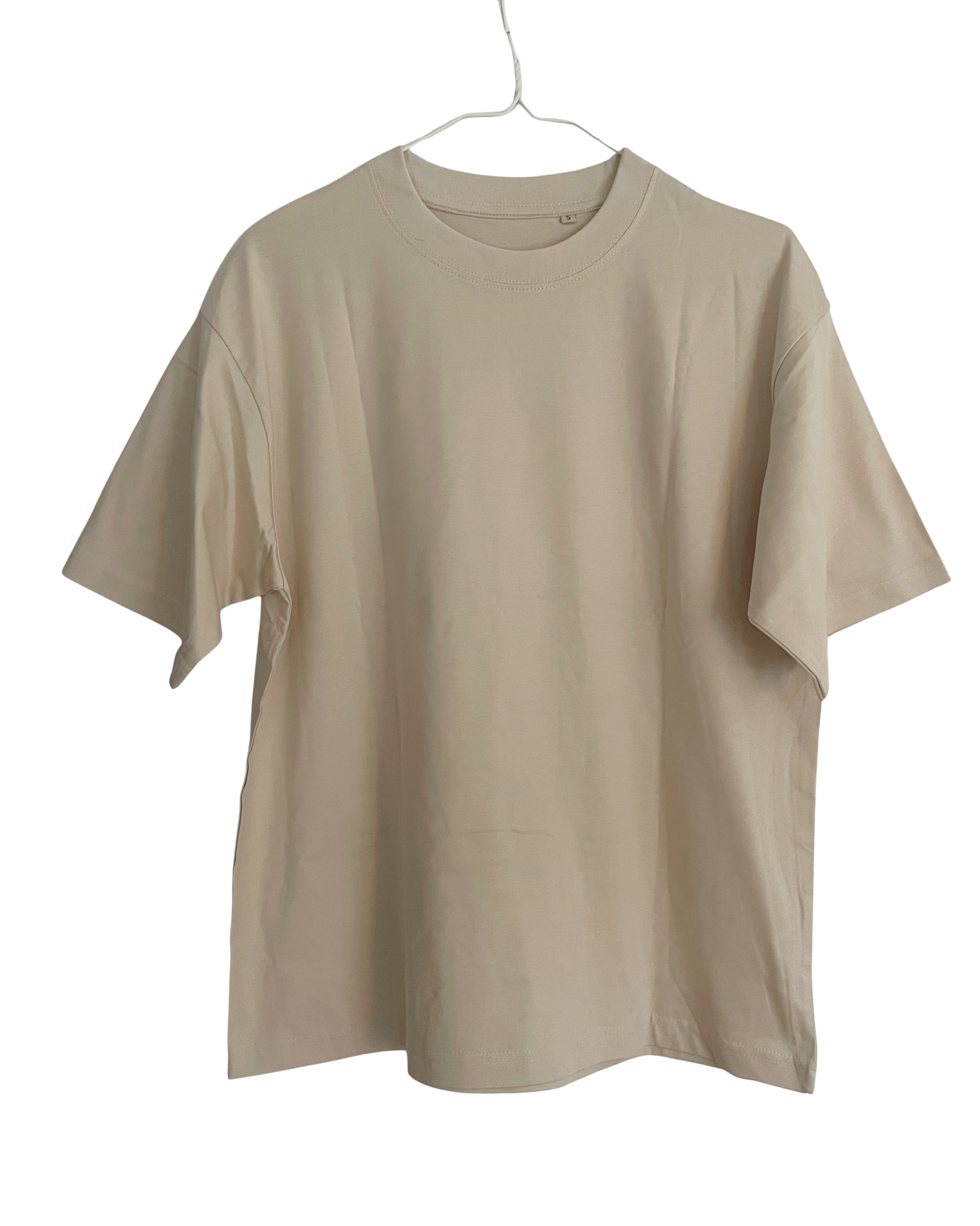 T-shirten er lavet af 100 % økologisk bomuld. Produktet har en boxy pasform, hvilket betyder, at det er bredere end traditionelle t-shirts. Dette giver den et moderne og nutidigt look og er samtidig meget behagelig at have på. Vi anbefaler at gå én størrelse ned, da produktet er stor i størrelsen.