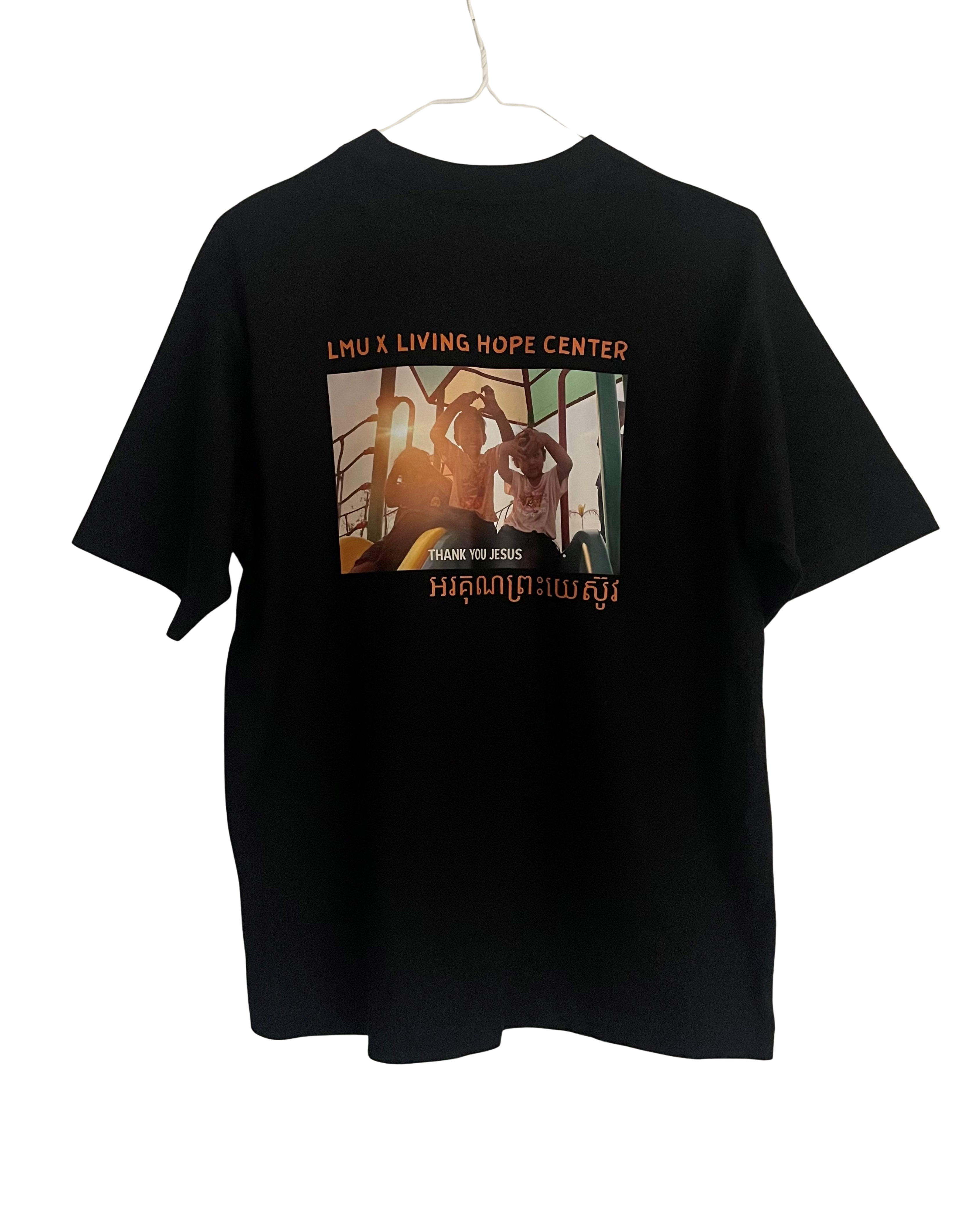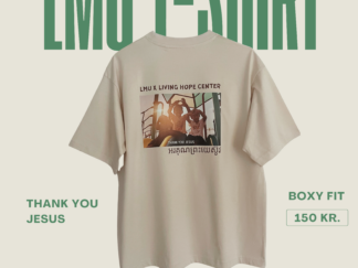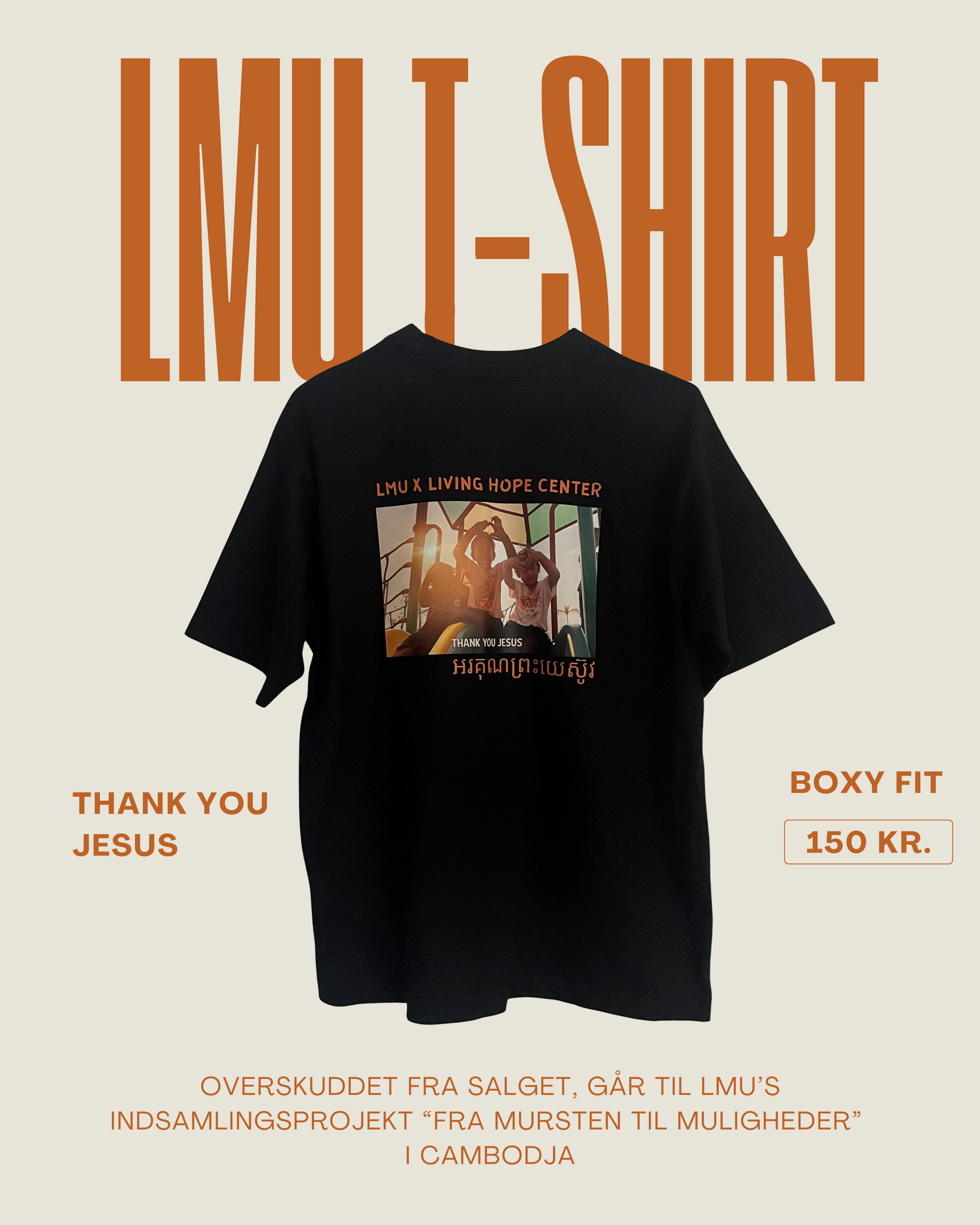 LMU-missionsprojekt t-shirten er en stilfuld og oversized t-shirt, der med sit rygdesign viser børns taknemmelighed til Jesus og missionsprojektet, så børn og unge kan møde Jesus igennem Living Hope Center i Cambodja.