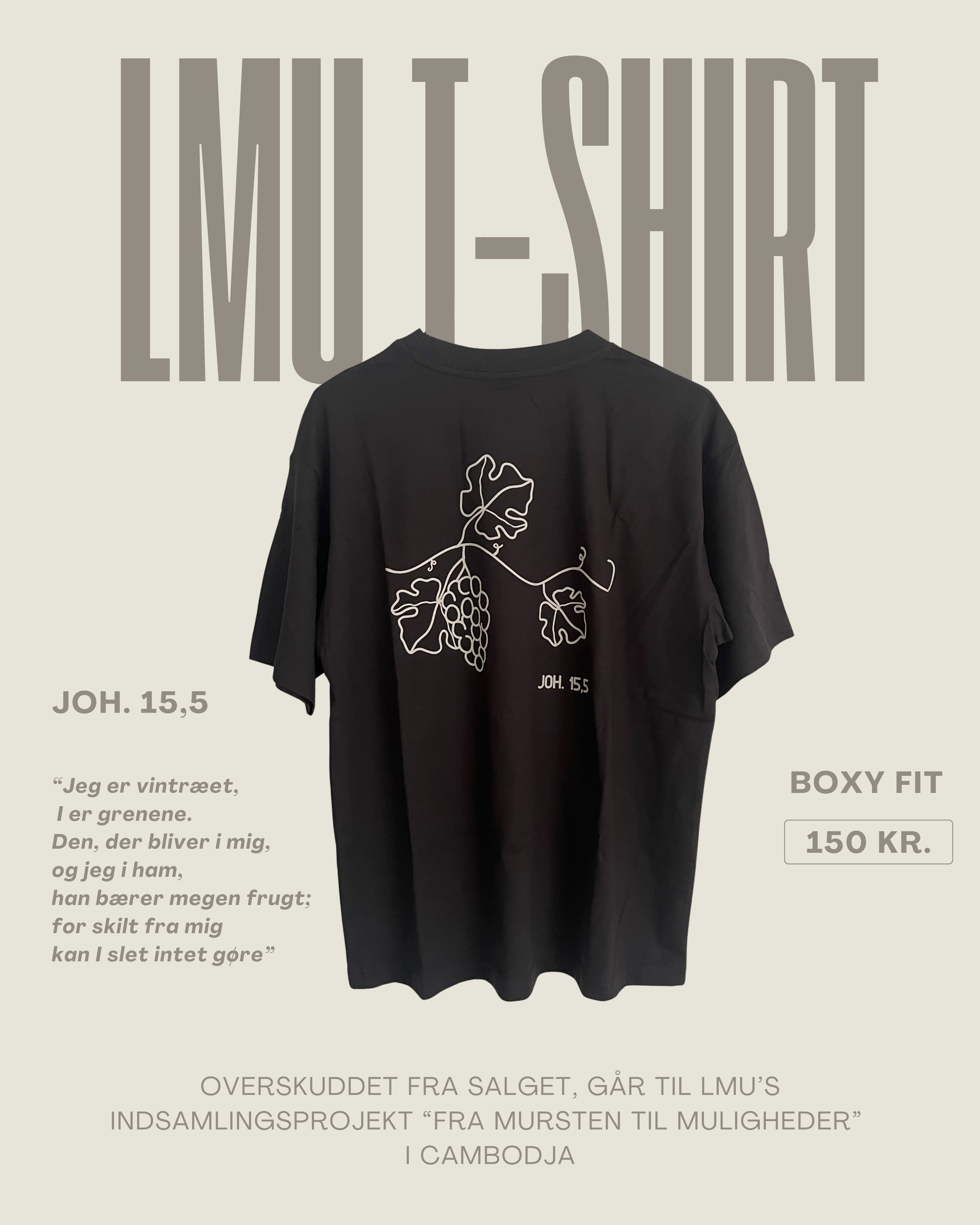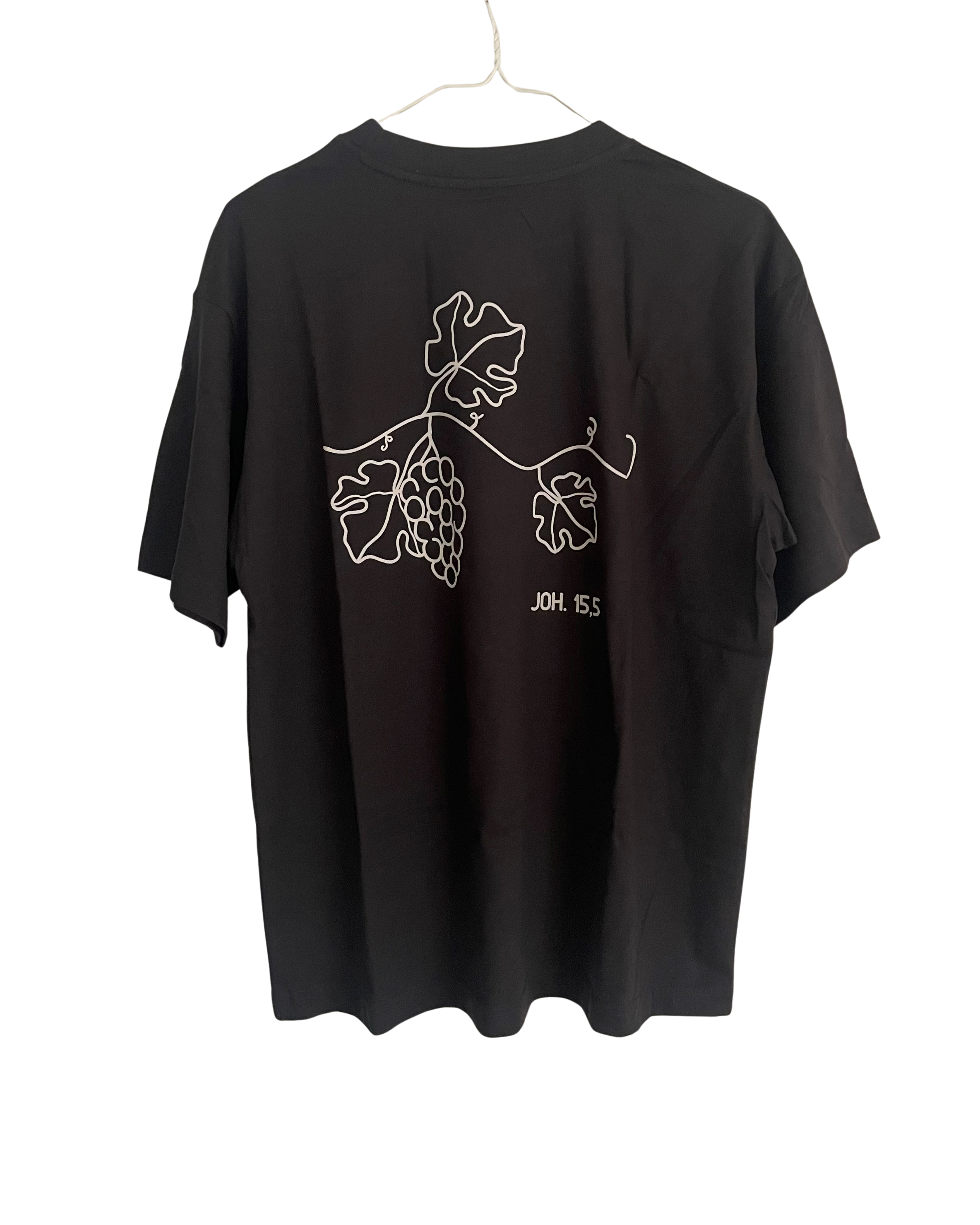 Vingren t-shirten er en stilfuld og oversized t-shirt, der med sit rygdesign henviser til Joh. 15,5, hvor Jesus siger om sig selv, at han er det sande vintræ, og at vi er grenene.